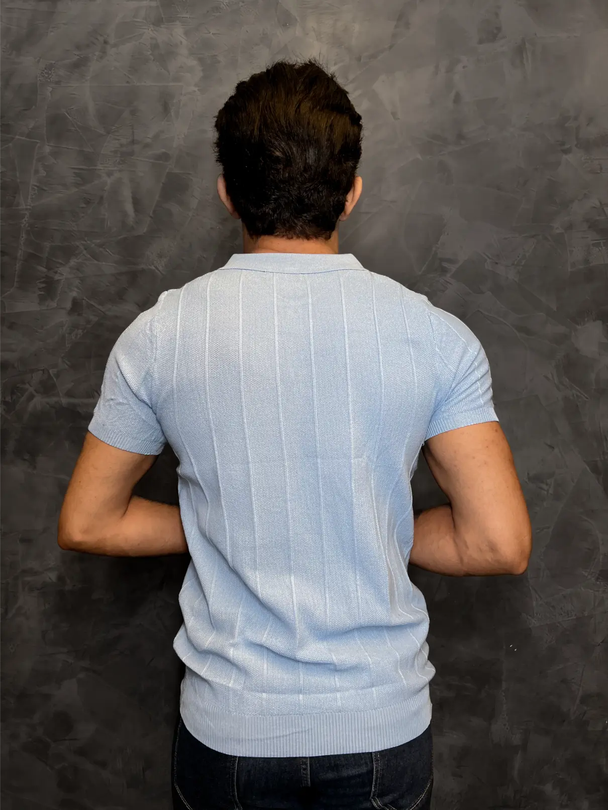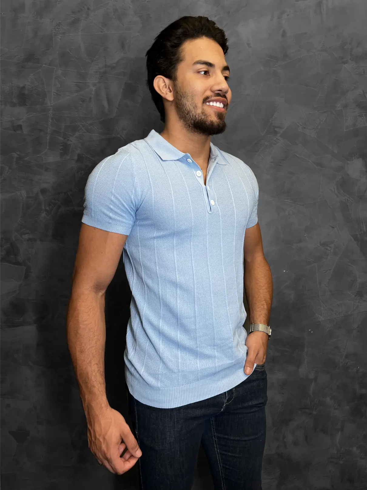 Gola Polo Tricot Zetsus Allure foi nomeada por sua capacidade de criar um visual instantaneamente magnético e sofisticado. O segredo está no seu tricot texturizado, que, como visto na imagem, possui um padrão canelado vertical que alonga e define a silhueta.