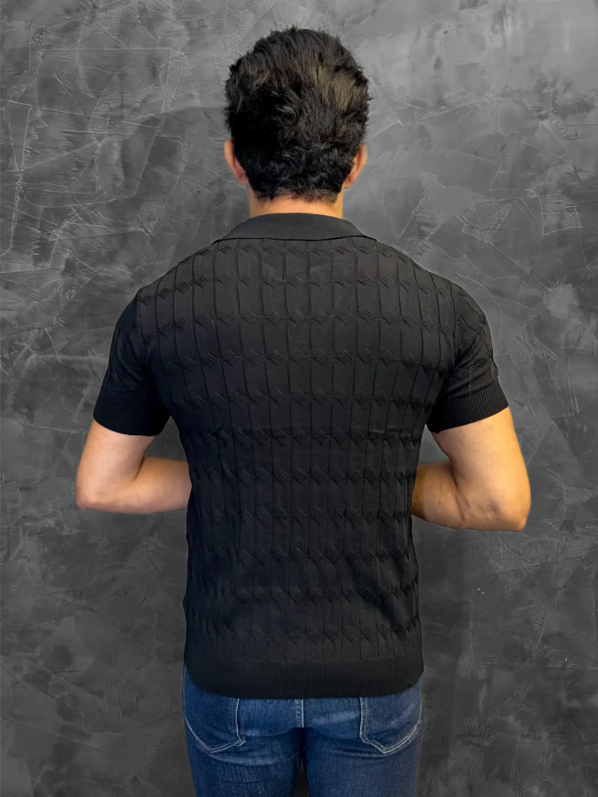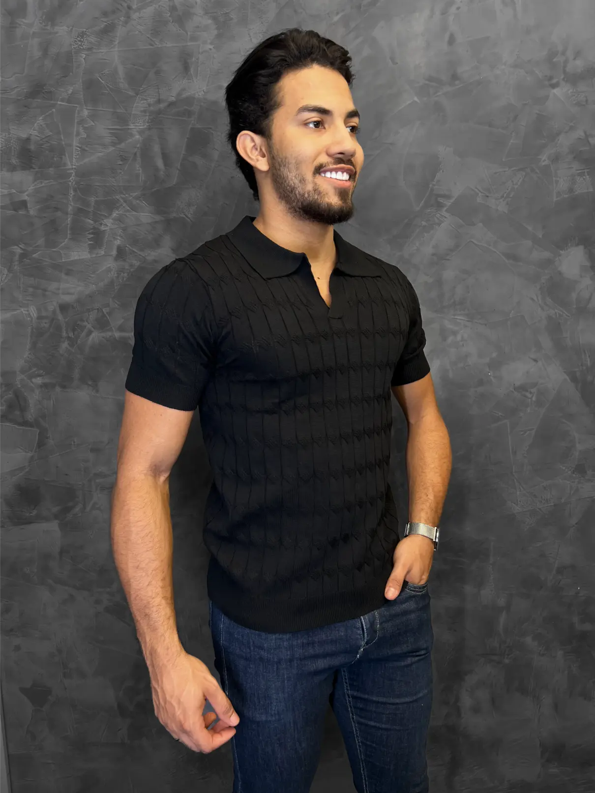 Gola Polo Tricot Zetsus Roma foi nomeada por sua capacidade de criar um visual instantaneamente magnético e sofisticado. O segredo está no seu tricot texturizado, que, como visto na imagem, possui um padrão canelado vertical que alonga e define a silhueta.