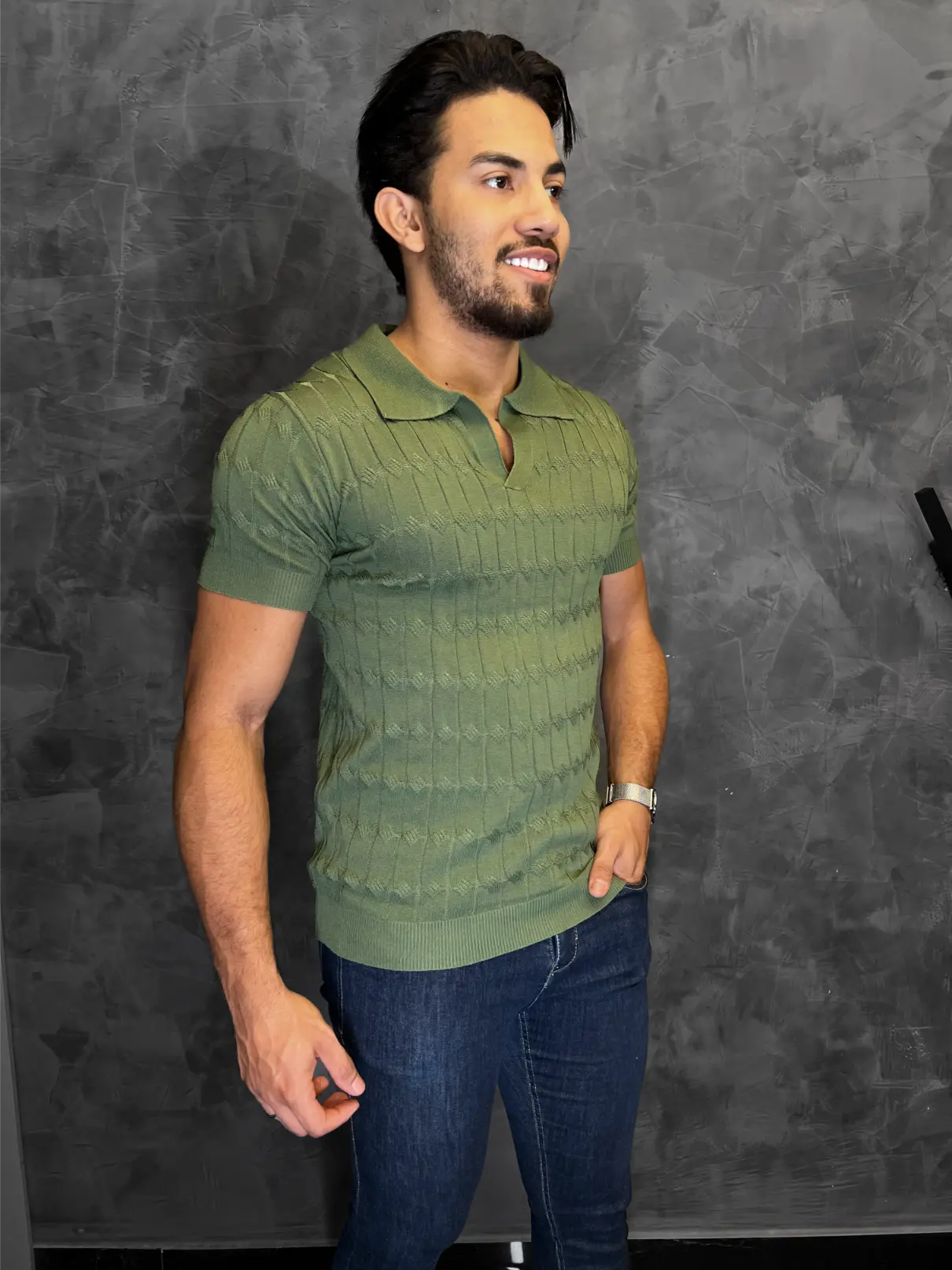 Gola Polo Tricot Zetsus Roma foi nomeada por sua capacidade de criar um visual instantaneamente magnético e sofisticado. O segredo está no seu tricot texturizado, que, como visto na imagem, possui um padrão canelado vertical que alonga e define a silhueta.