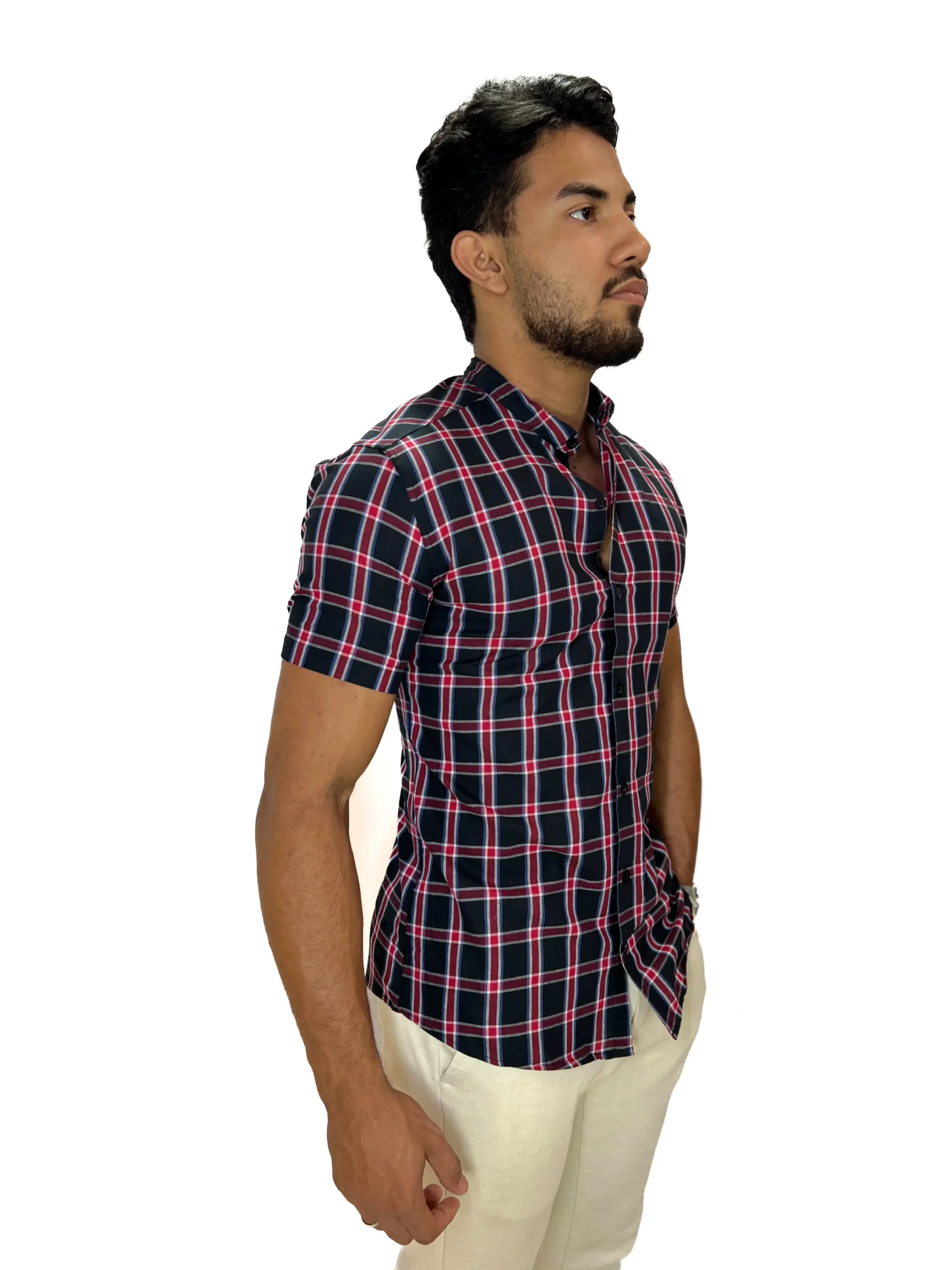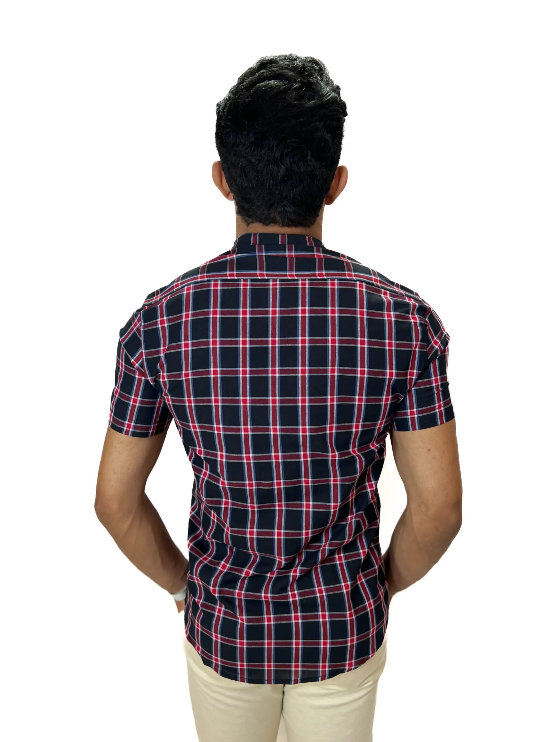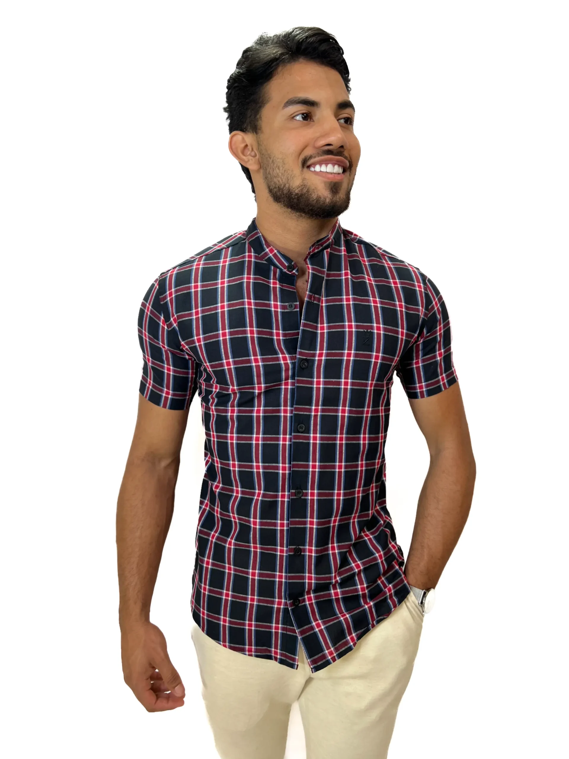 O xadrez discreto elimina o excesso visual. A gola padre limpa o look.