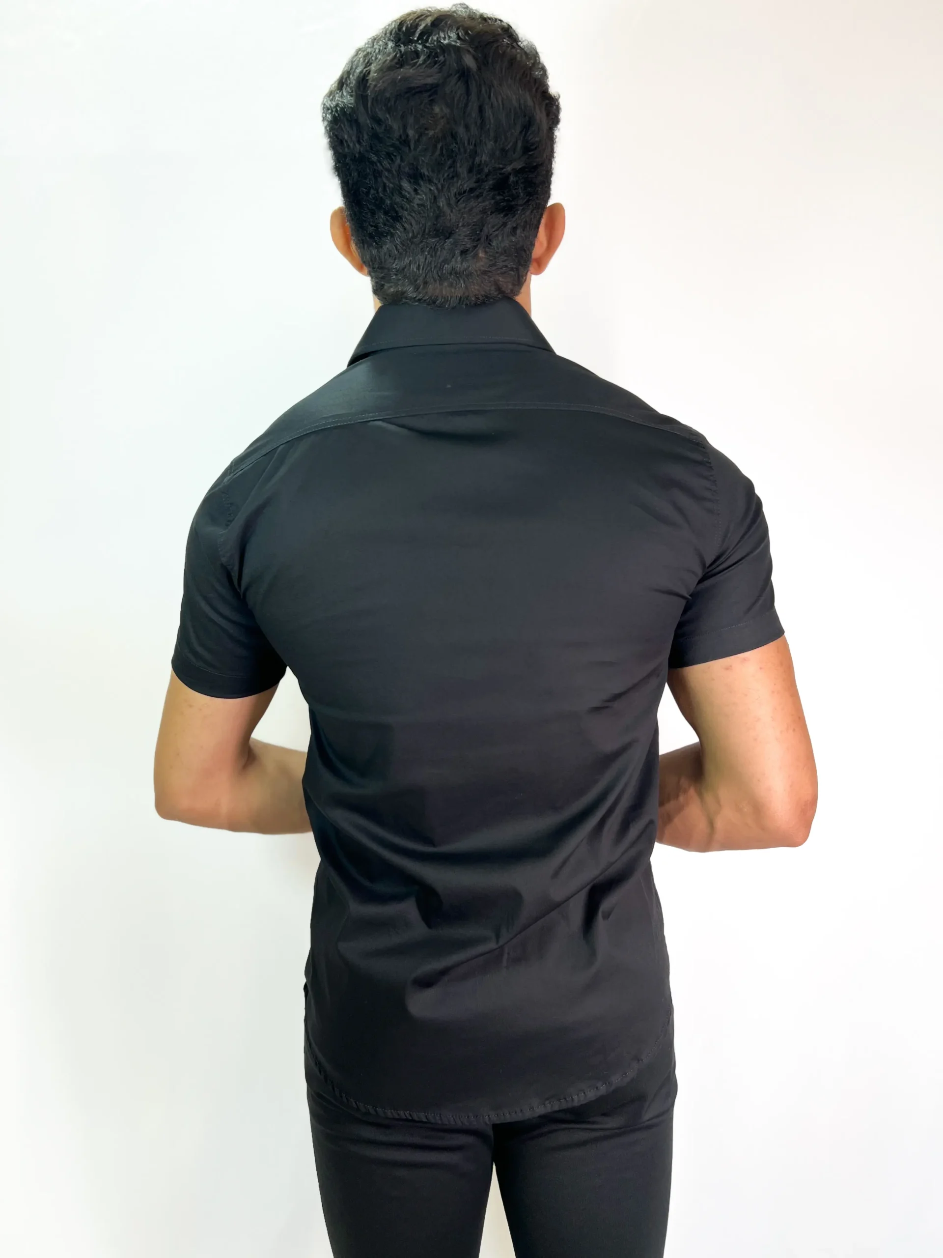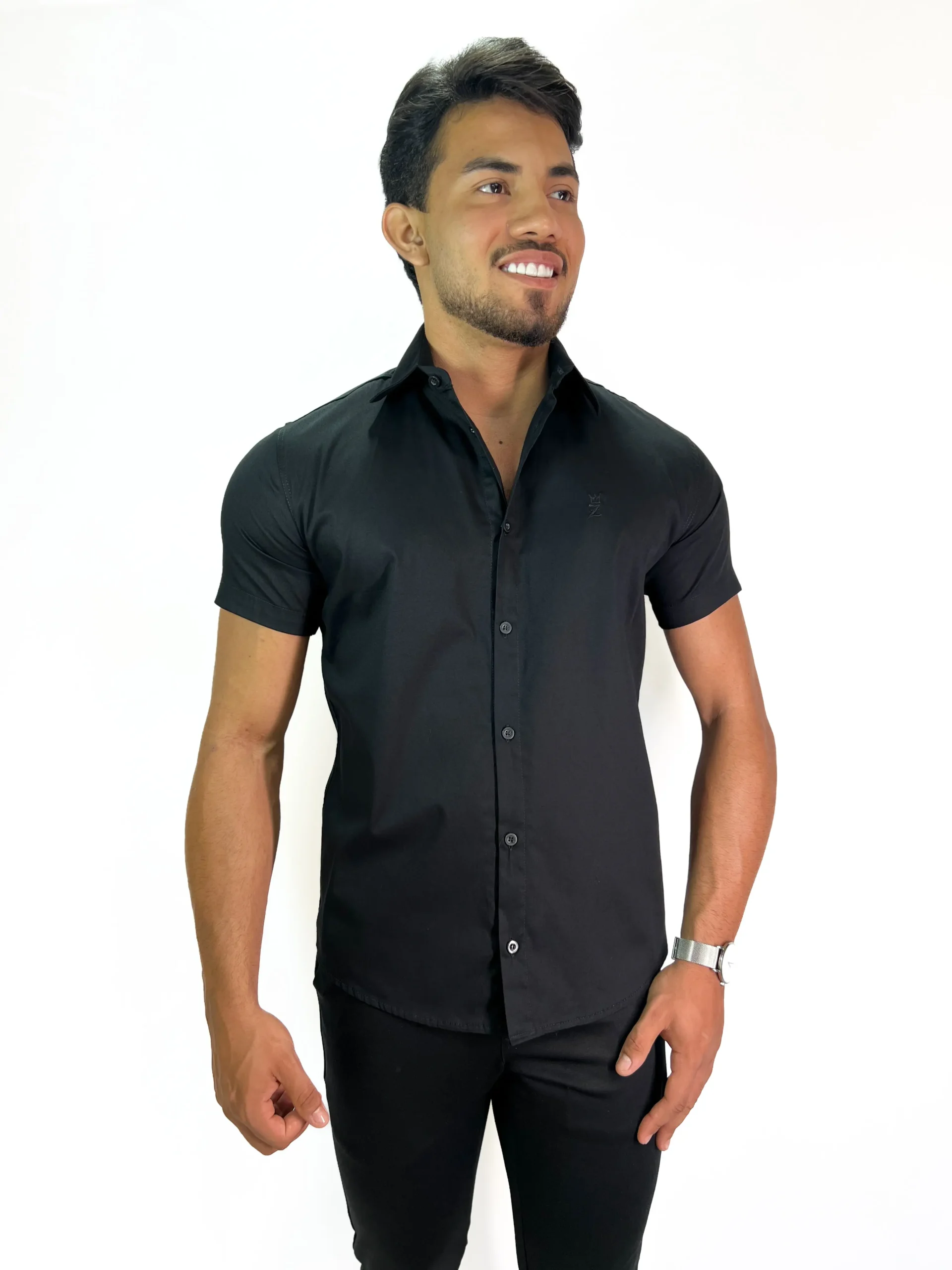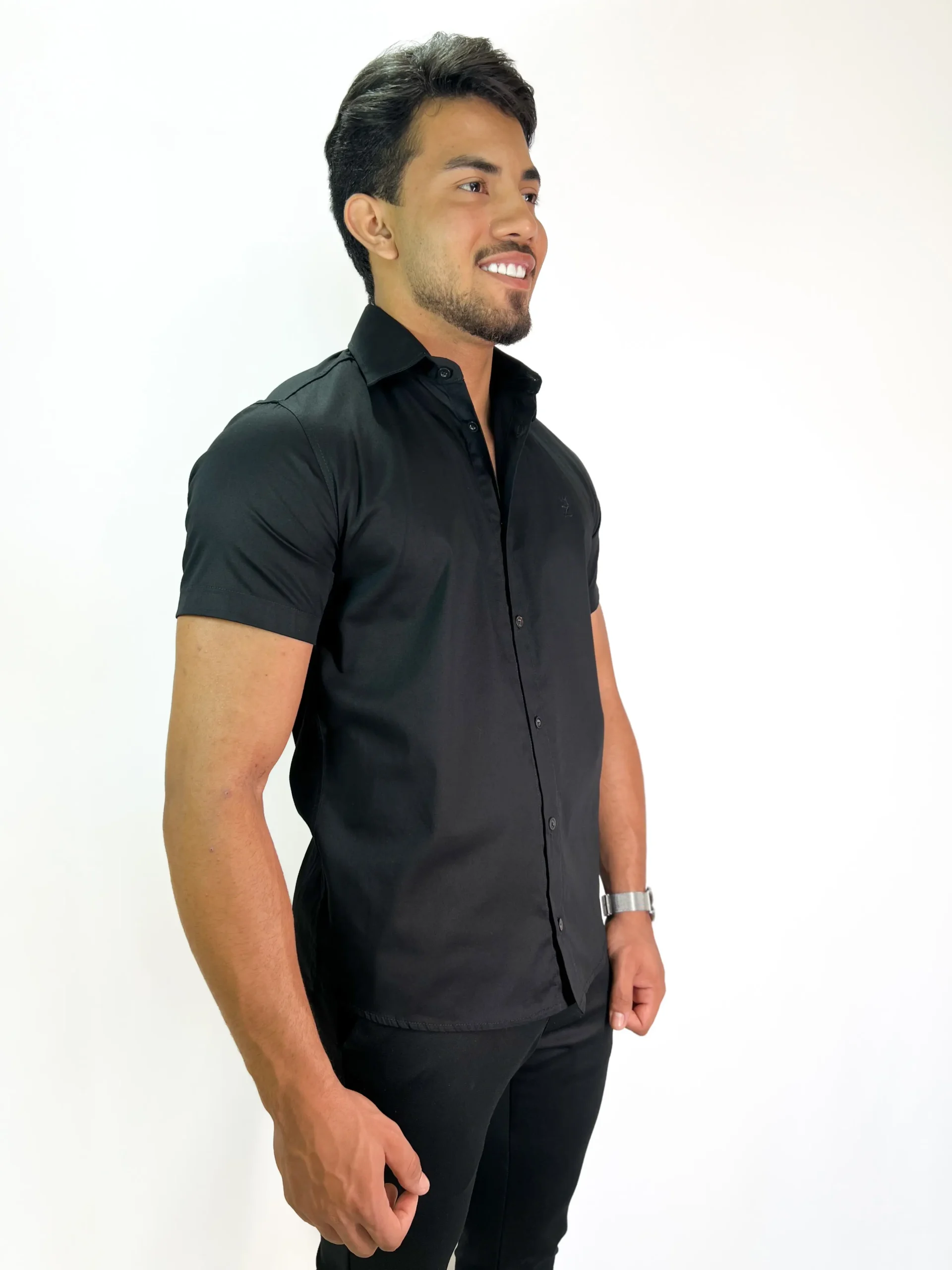 Camisa Social Manga Curta Colarinho Italiano Preta