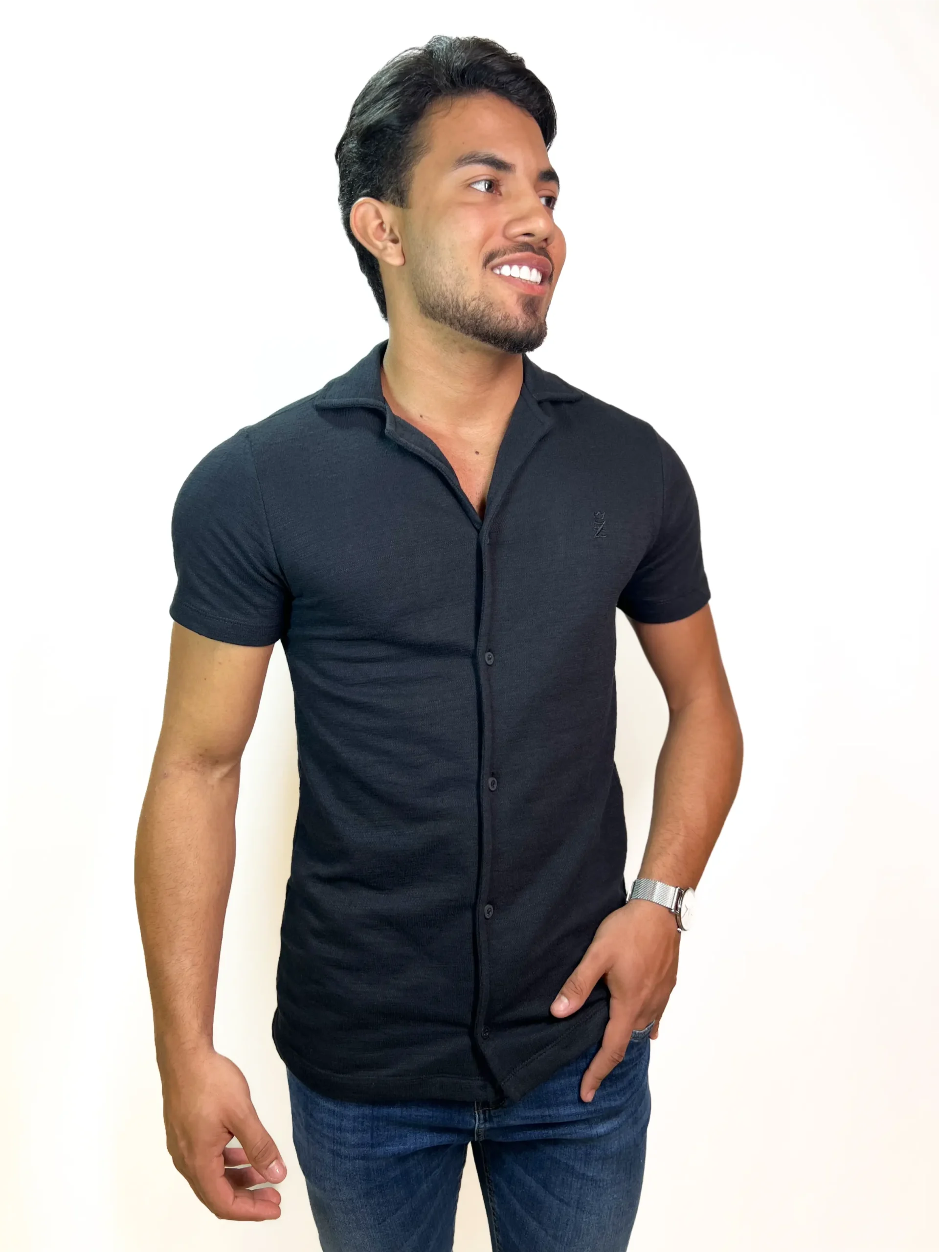 Camisa Social Zetsus Netuno Manga Curta Texturizada Preta