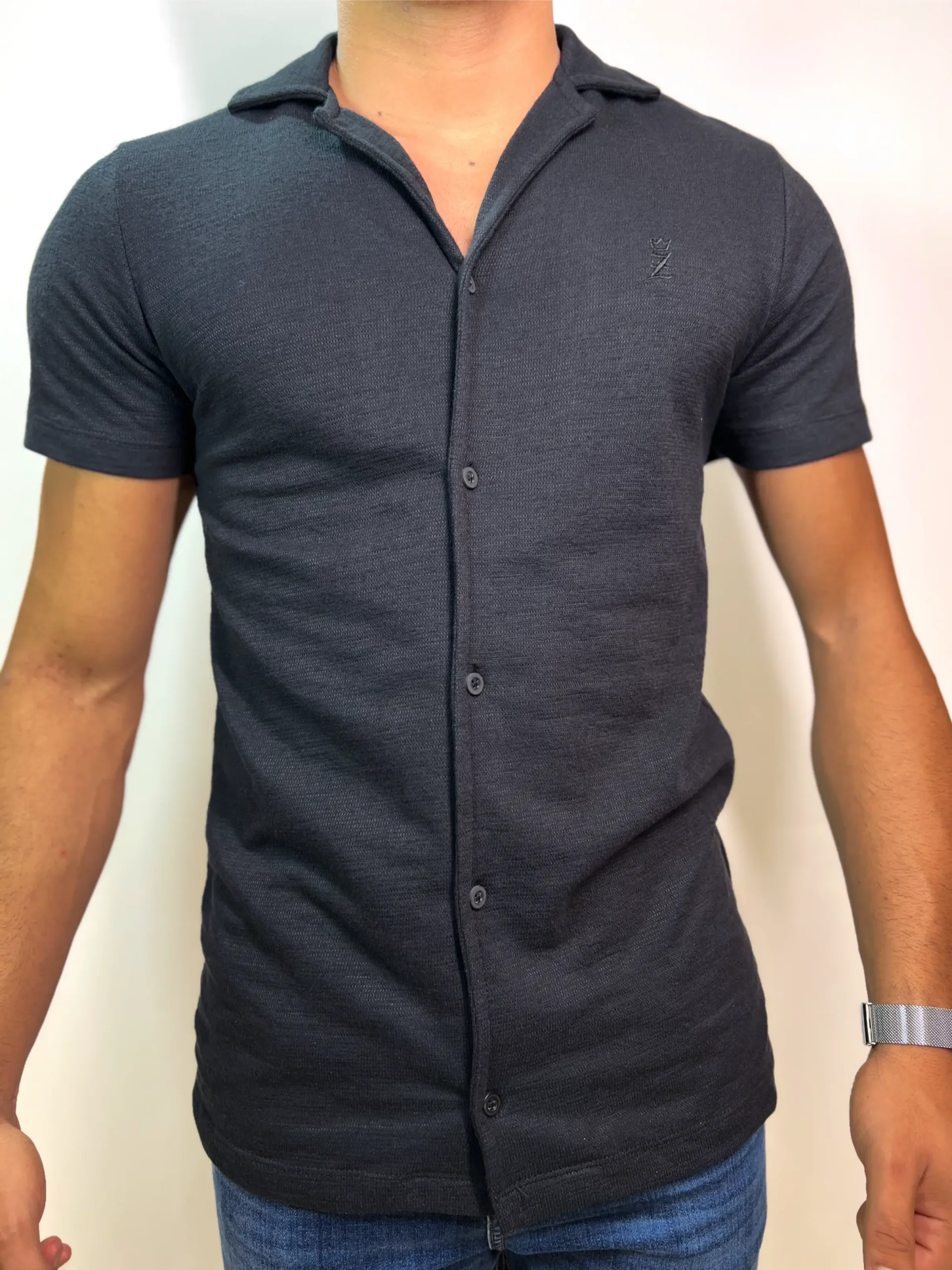 Tecido com microtextura discreta, corte reto e gola firme. A modelagem segue a linha da camisa social tradicional, mas com mangas curtas e estrutura mais leve para uso diário.